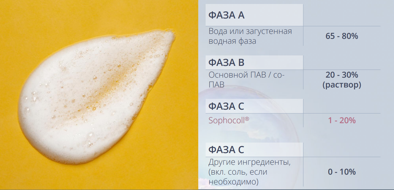 Sophocoll® совместим с холодным способом введения, легко диспергируется, стабилен в широком диапазоне рецептур, подходит для мицеллярной воды, шампуней, гелей для душа, пенок для умывания и средств для волос.